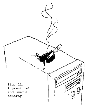 Without smoke, computor is simply choking. In non-smoking rooms, they even have to put filters on monitors, because they shine too strongly, which can be very harmful to eyes. In an eternally smoky room there's no such problems. Monitors are covered with a fine layer of dust, glued by smoke and sweat, which protects the user from the deadly radiation of the screen.