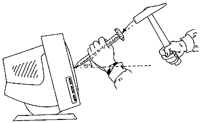 Accidental rafall from your household's machine-gun can also bring serious damage to the monitor; so can a poorly aimed hand-grenade. Because of all of this, it is strongly recommended that you protect your monitor's front side with a thick plate of bullet-proof steel. Cut a round hole in the plate, cca 4-5 cm in radius. Borrow a binoculars from a neighbour, take it apart (experience you got with the screw-diver on a keyboard can be useful here - if that too won't do, try banging the edge of your desk with binoculars, using strong, shoulder-based swings), It should also be said that a computer-monitor is extremely un-suitable for cutting with a chain-saw. It is made from hard plastic which squiggles and wiggles and tears and breaks during the procces, so the cutting edge is hardly ever a perfect one. Espec. when you dip your chainsaw into the front-end glass, skweakage and breakage will go beyond description. It is therefore a good practice to use protecting glasses because a small piece of plastic (or glass, or metal) can quickly end up in your eye. For the same reason, cutting a computer-monitor with a chain-saw is not recommended for children under 3 years, because they can easily swallow or inhale smaller parts! ![]() | ||||||